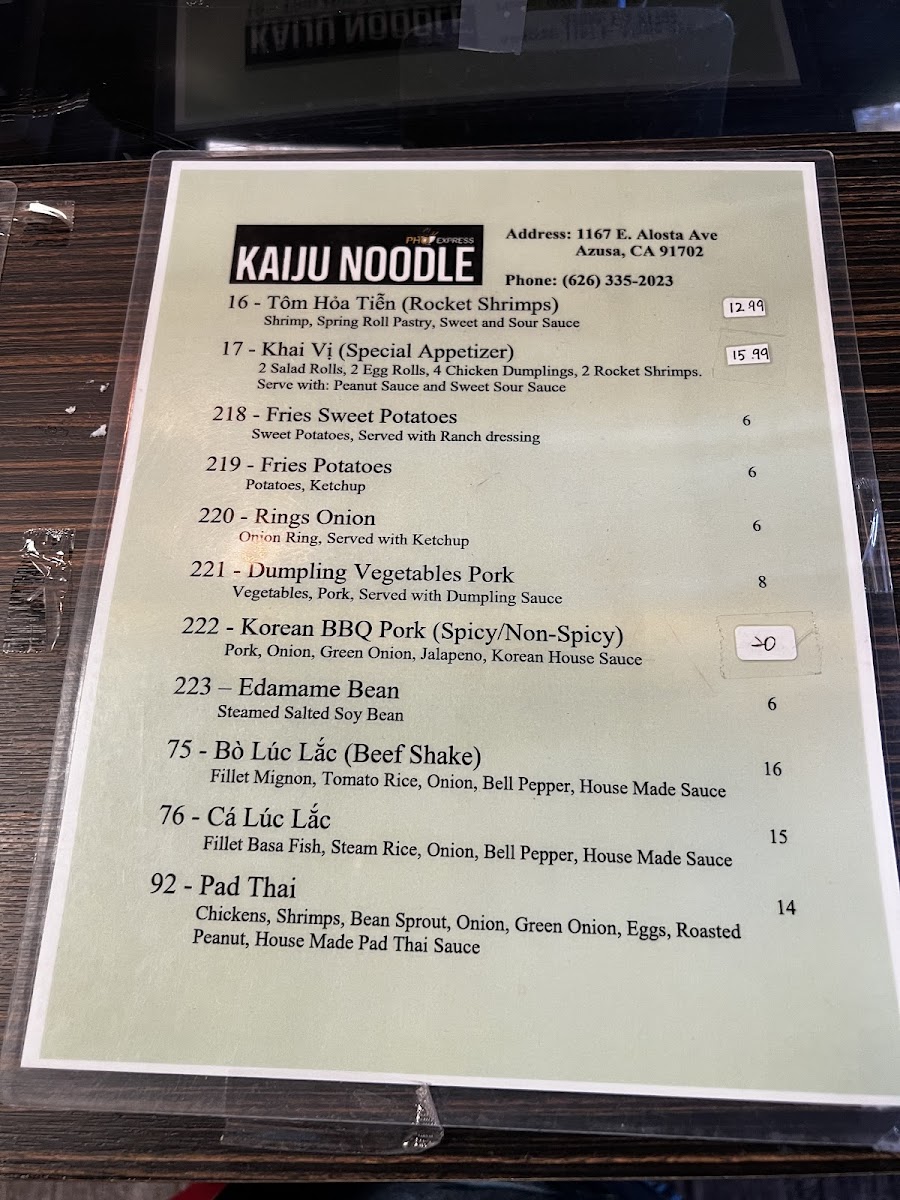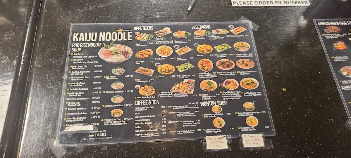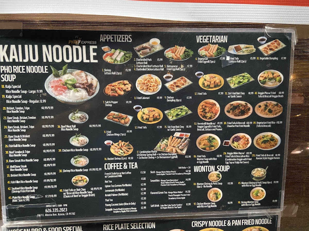 Welcome to Kaiju Noodle House, a hidden gem located at 1167 E Alosta Ave, Azusa, CA. This family-owned restaurant boasts a vibrant and welcoming atmosphere, perfect for food lovers. The menu features an impressive selection of delicious offerings that cater to all preferences, with standout dishes including vegetarian pho prepared with a rich vegetable broth, and the indulgent chow fun, loved for its generous portions and hearty flavors.